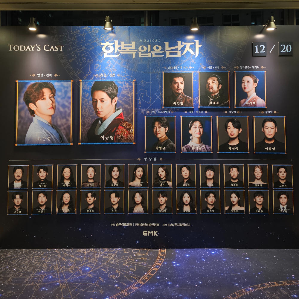 2막 엔딩에서는 천장부터 객석 벽까지 별자리 조명이 가득 채워진다. 그 장면을 보고 있으면 영실과 세종의 이야기가 잠시 그 별빛 안에 머무는 것처럼 느껴진다. 증명되지 않았고 받아들여지지 않았지만 그래도 말해졌다는 사실. 완벽하지 않더라도 절반이라도 해보려는 마음. <한복 입은 남자>는 장영실 미스터리를 통해 그 태도 자체를 조용히 남기는 작품이었다.